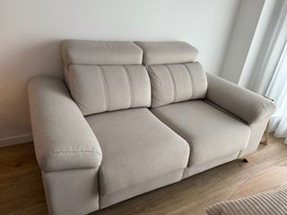 Sofá de dos plazas con un diseño moderno y confortable. Su tapicería de tela le da un toque acogedor a cualquier estancia. - Tapicería de tela desenfundable con cremallera - Asientos extensibles -2 Arcones en ambos laterales - uno lateral también se extiende para hacer una cama. _ Cabeceros reclinables - Sentada confortable con riñoneras que acogen muy bien las lumbares - Color beige neutro Milán crema tacto suave ideal para niños y mascotas que rascan. ( no tenemos mascota) -Tiene un año de uso, comprado en noviembre de 2024. Lo cambio porque me he mudado y en mi nueva casa necesito otro tamaño. Es el modelo Sara del fabricante