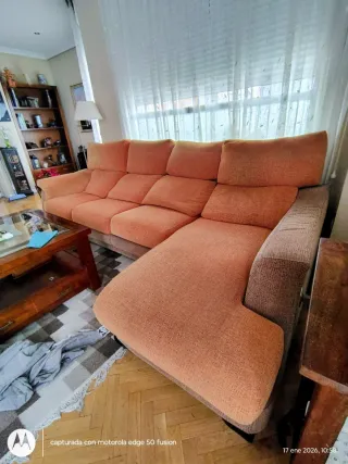 Sofá con chaise longue en perfecto estado. Los asientos se sacan y el respaldo se reclina en todos los asientos con lo que se puede convertir en una cama de matrimonio. Regalo manta de la última foto Un mueble cómodo y espacioso para tu salón. - Tapicería de tela. - Color marrón y naranja.