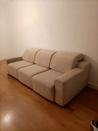 Sofá de tres plazas con un diseño moderno y confortable. Se puede extender para convertirlo en cama o en formato chaiselong con sistema tipo carro con ruedas. - Respaldo reclinable. - Tapicería de tela. - Necesita limpieza. - Color beige neutro. - 3 asientos independientes y extraíbles. Está en planta primera pero hay ascensor y garaje para facilitar la carga.
