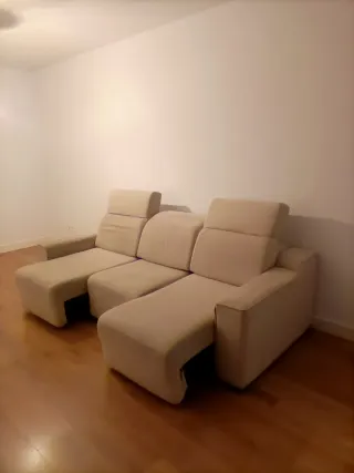 ** Tiene pocos meses y apenas se ha usado, y siempre con funda ** Sofá moderno y muy versátil, tapizado en color neutro y fácil de combinar. Dispone de respaldos y reposabrazos reclinables que permiten varias posiciones: sofá tradicional, chaise longue o zona de descanso tipo cama. Asientos amplios y cómodos, ideal para salón o sala de estar. Incluye dos taburetes pequeños a juego, perfectos como asiento extra o mesa auxiliar. Estructura robusta y diseño actual en excelente estado.
