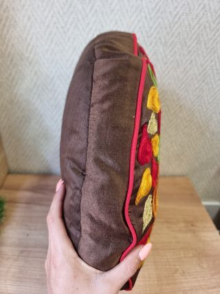 Precioso cojín redondo con un bordado de la mano de Fátima y un árbol de la vida. Es una pieza única, ideal para decorar tu hogar con un toque étnico. - El cojín está hecho a mano en la India. - Presenta un diseño detallado y colorido.