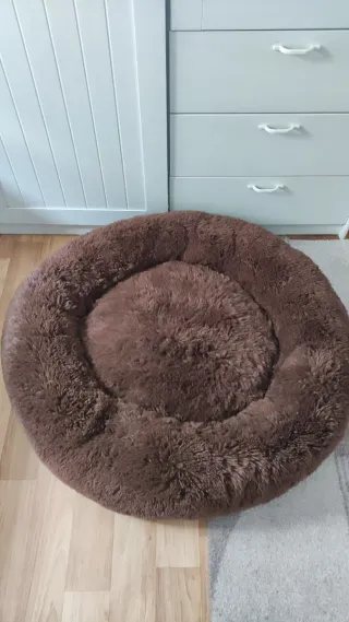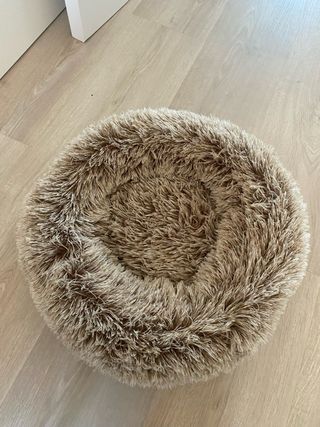 Cama redonda y mullida para mascotas, con un diseño acogedor. - 65cm de circunferencia y 22cm de altura máxima. - Sin apenas uso y lavada. - Material suave y confortable. - Forma circular con borde elevado.