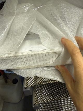 Colchón de matrimonio con cubierta de tela. - Color gris claro. - Bordes redondeados.