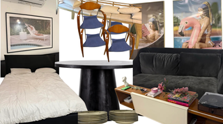 Conjunto variado de artículos para el hogar, incluyendo muebles, decoración y elementos para la cocina. - Cama con cabecero negro. -colchon - Mesa de comedor redonda negra. - Sillas de madera con asiento azul. - Sofá de terciopelo negro. -mueble de madera con tabla blanca. - tres cuadros decorativos. -1 espejo - Juego de platos, cubiertos, cafetera, cuchillos, vasos, tazas.