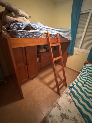 Conjunto de muebles para habitación juvenil, ideal para optimizar el espacio. - Cama con cajones integrados. - Armario con cajones. - Cama supletoria. Para colchones de 90 a 105x190. Esta desmontada. Precio negociable.