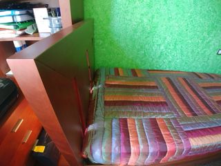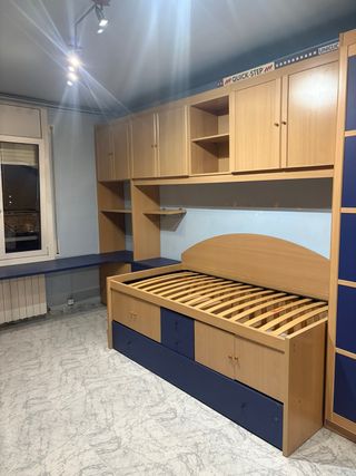 Conjunto de dos literas de madera, cama supletoria, armario amplio, estantería, cajonera y escritorio. Estructura en color madera clarita y morado. Son de madera de buena calidad y se encuentran en buen estado, apenas han sido usadas. Incluyen dos colchones y las colchas. Bajo la cama hay una cama supletoria. Medidas: Literas: 2'81 (hasta el final de la estantería) x 1'5 x 1. Las camas son de 1'95x 90. Escritorio: 1'33 largo x 54 ancho Se entrega desmontada.