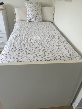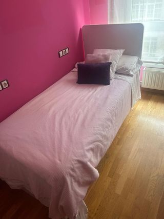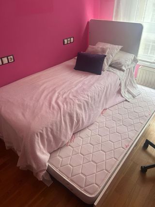 Vendo cama individual con cama nido supletoria. Se incluyen dos colchones y una almohada viscoelástica. La cama supletoria cuenta con ruedas para sacarla y patas para ponerla a la misma altura. El colchón principal (Flex) mide 190cm x 90cm y 20cm de grosor. El colchón supletorio (Prokolchon) mide 180cm x 80cm y 15cm de grosor. La estructura de la cama mide (incluyendo grosor de cabeceros) 199cm de largo y 97cm de ancho. La altura desde el suelo al inicio del colchón es de 35cm y 77cm hasta lo alto del cabecero. La estructura de madera tiene algunas zonas con signos de uso pero los dos somieres son nuevos.