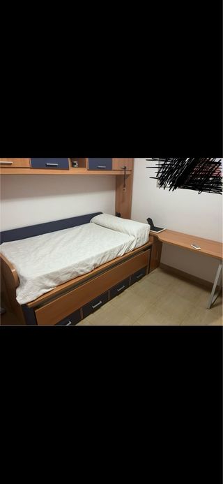 Cama individual de madera maciza con somier y colchón incluido. Integra una cama supletoria. - Estructura de madera robusta. - Diseño con cajones de donde se extrae la segunda cama - Incluye: - Colchones: El colchón principal tiene 2 años de uso muy casual y el colchón supletorio 2 años y se ha usado en 5 ocasiones. - 3 juegos de sábanas: 2 de la cama principal y una de la supletoria (todas del Corte Inglés) - 3 almohadas con sus fundas - Somier - 195 (lado largo) x 109 (lado ancho) x 44 (altura) - Cama supletoria - 189 (LL) x 94 (LA) x 35 (A)