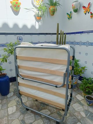 Cama supletoria plegable. Medidas desplegada: 80cm ancho x 180cm largo. Medidas plegada: 80cm largo x 65cm ancho x 45cm alto. Incluye dos fundas: la original de compra y otra hecha a mano. Se vende por falta de uso. Está nueva.
