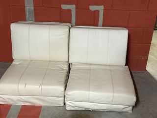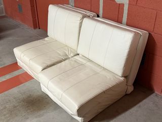 Dos puffs cama en color blanco, fabricados con piel sintética. Se encuentran en buen estado, aunque presentan algunas señales de uso. - Perfectos para usar como asientos adicionales o camas supletorias. - Diseño sencillo y elegante. - Fáciles de limpiar. El precio es por unidad, y si te llevas los 2 lo dejo todo por 50. precio en tienda 120 cada uno
