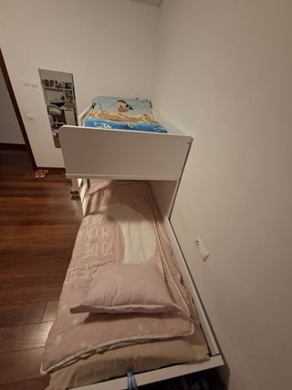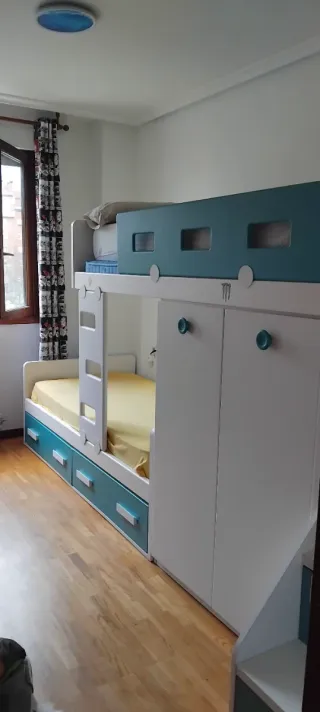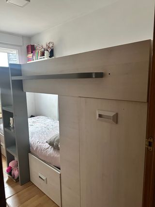 Se vende litera tipo tren ideal para habitación infantil o juvenil. Diseño práctico y compacto, perfecta para optimizar espacio. Características: • Para 2 colchones de 190 x 90 cm • Medidas totales: • Largo: 285 cm • Ancho: 124 cm • Alto: 149 cm • Incluye armario integrado y 2 cajones grandes de almacenaje • Estructura robusta y estable • Color neutro, fácil de combinar • Se vende sin colchones Ideal para familias con dos niños o para habitaciones con espacio limitado. Se vende montada. Desmontaje y transporte a cargo del comprador. Precio reducido por este motivo.