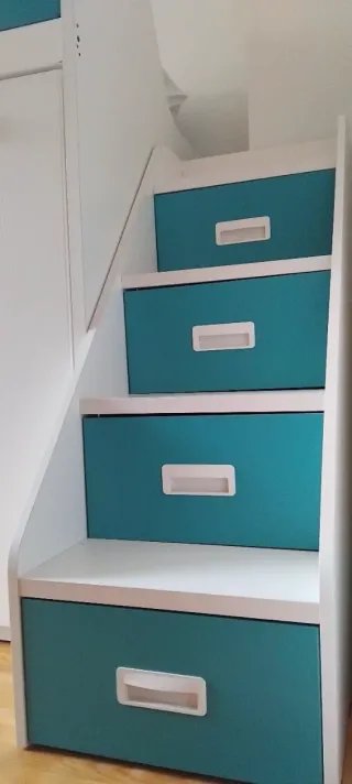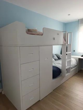 Cama litera tipo tren en muy buen estado. Diseño funcional y moderno. - Incluye armario integrado. - Dispone de cajones para almacenamiento adicional. - Escalera lateral para acceder a la cama superior. - los agarradores de colores que hemos incorporado a la escalera para dar más seguridad son del Ikea y los hay disponibles de otros colores por solo 3€ el par. -incluye somier -no incluye colchones -el interesado debe encargarse del desmontaje y traslado de la cama (edificio con ascensor)