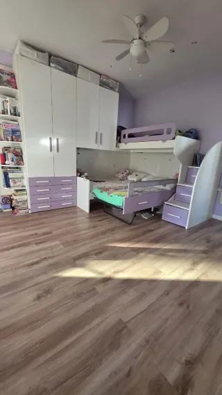Conjunto de litera tren con diseño moderno. - Estructura robusta. - Acabado en blanco con detalles morado y beig - espacio para dos camas de 90×190cm - Armario de 1 metros de ancho con doble fondo. El primer fondo barra de colgar y en segundo fondo dos baldas de gran espacio - Dimensiones totales 3 metros largo × 1 metros ancho Se vende por cambio. Muy bien cuidado con solo 3 años de uso.