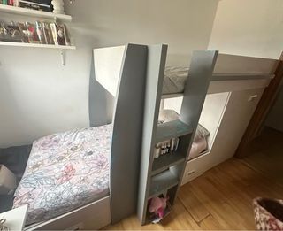 Cama tren con un diseño moderno y funcional. Tiene armario con 3 baldas y una barra para colgar. Está la cama perfecta, lo único es que la parte gris la pintamos y con el tiempo se ha ido desgastando la pintura. Nada roto ni ningún desperfecto. La vendo por reforma de habitación, ya he encargado una cama a medida, quiero deshacerme de ella para poder ya montar la otra cama, de ahí el precio. - Incluye dos camas. - Dispone de cajones para almacenamiento. - Cuenta con una estantería integrada.