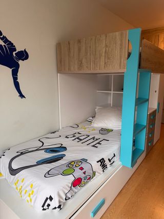Cama tren de estilo moderno, ideal para optimizar el espacio. Sin uso ninguno - Estructura blanca y azul. - Incluye armario. - Cajones inferiores para almacenamiento. No hago envíos, quien lo quiera se tiene que encargar de desmontar y trasporte.