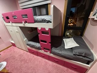 Cama tren con un diseño moderno y funcional, ideal para optimizar el espacio. - Incluye armario integrado. - Dispone de cajones para almacenamiento adicional. - Estructura robusta y segura. - Acabado en tonos neutros y detalles en rosa.