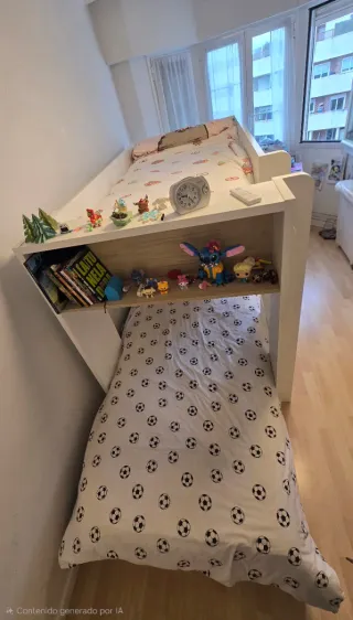 Mueble modular de la marca Tegar, ideal para optimizar espacios. Combina una cama tipo tren con una práctica mesa extraíble. - Estructura principal en madera y detalles en blanco. - Mesa extraíble con superficie de madera. - Compartimentos de almacenaje integrados. NO SE HACEN ENVIOS. NO SE HACE DESMONTAJE NI MONTAJE.
