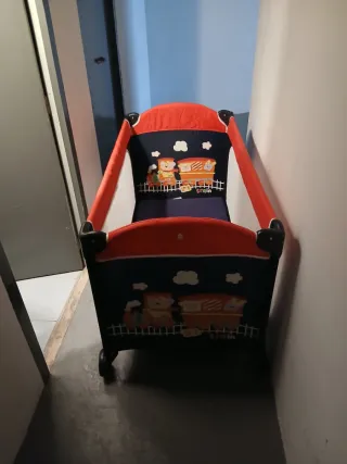 Cuna de bebé de madera con un diseño encantador. La doy con el colchón está en buen estado lo verde yo lo pinté de color turquesa lo doy con sábanas también calentitas azules con un oso. - Estructura de madera natural. - Detalles decorativos de tren en los laterales. - Barreras de seguridad.