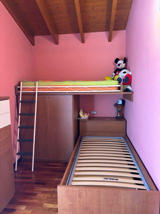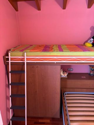 Habitación juvenil con literas y armario integrado Vendo conjunto de muebles en excelente estado: cama alta con armario y escritorio inferior, más cama individual inferior extraíble. Fabricado en madera muy resistente y funcional. Ideal para habitación infantil o juvenil, aprovechando al máximo el espacio. Incluye escalera metálica y somieres.
