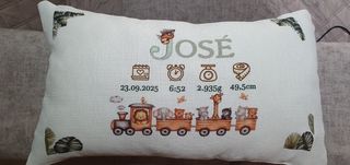 Cojín decorativo con el nombre y un diseño de tren con animales. Personalizable con el nombre, peso, medida y fecha de nacimiento del recién nacido. Precioso regalo de bienvenida que durará para siempre y quedará ideal como decoración en su habitación. Con relleno. Material de Poliéster. Medidas 50x 30cm. - Detalles de fecha (23.09.2025), hora (6:52), peso (2.935g) y medida (49.5cm). - Adornos de hojas y ramas en las esquinas.