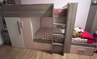 Cama tren con un diseño moderno y funcional, ideal para optimizar el espacio. - Incluye armario integrado. - Dispone de cajones para almacenamiento adicional. - Estructura robusta y segura. - Se incluyen 2 colchones.