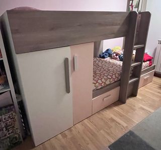 Cama tren compacta y práctica, ideal para habitaciones infantiles o juveniles. - Incluye dos camas y un armario. - Dispone de dos cajones con espacio de almacenaje bajo la cama inferior. - Estructura en buen estado, lista para usar.