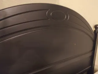Estructura de cama completa con un diseño clásico y elegante. - Fabricada en madera resistente. - Acabado en tono marrón oscuro. - Cabecero curvo con detalles ornamentales.