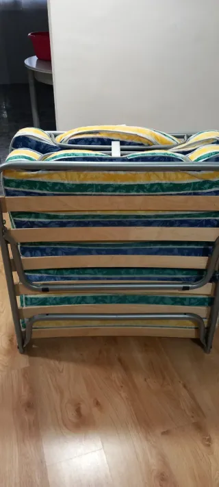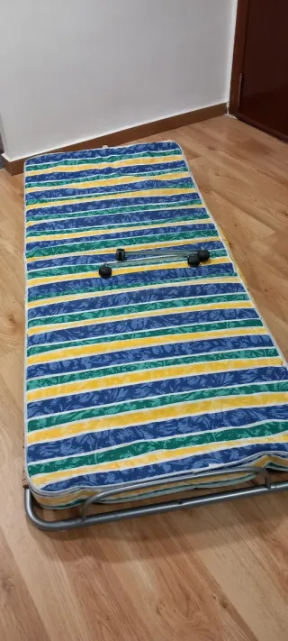 Cama supletoria en buen estado, ideal para invitados o espacios reducidos. Fácil de plegar y guardar. - Estructura metálica. - Colchón de tela con rayas azules, amarillas y verdes.