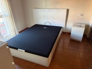 Se vende cama de matrimonio de 150cm con base tapizada. Incluimos el cabecero (90€) totalmente nuevo, se cuelga fácilmente con dos cuelga fáciles. Ademas incluimos faldon beige que se ve en la foto. Cojines no incluidos. - Medidas: 150cm. - Color: beige y blanco. - Materiales: tela y madera.