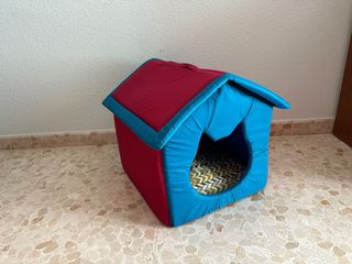Acogedora caseta de interior para mascotas, con un diseño en forma de casita. Estructura acolchada, desmontable y lavable. Valido para gatos o perros pequeños. Medidas de 35*40*42cm. Incluye cojín. No se ha llegado a utilizar ya que por desgracia falleció mi perrito justo el día en que me llego mi compra.