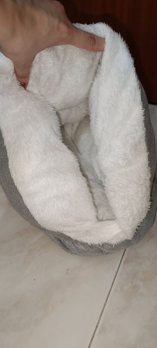 Cama acogedora para gatos pequeños. Es de color gris y blanco, con un interior de felpa blanca muy suave. - En perfecto estado, sin usar. Se entrega recién lavada - Ideal para gatos pequeños de aprox. 2'5 kg - Perfecta para que tu gato descanse. - Diseño tipo cueva, ideal para gatos que buscan un lugar seguro y cálido. - Material exterior de punto gris.