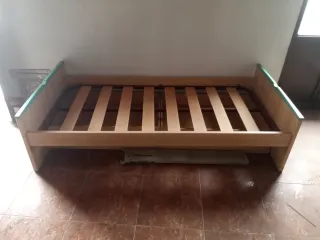 Se vende cama nido con su colchón y almohada. - Estructura de madera. - Tiene signos de uso, pero se encuentra en buen estado. - Cuenta con dos cajones para almacenaje. - Además, dispone de un segundo somier para hacer una segunda cama debajo de la principal.