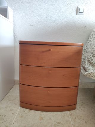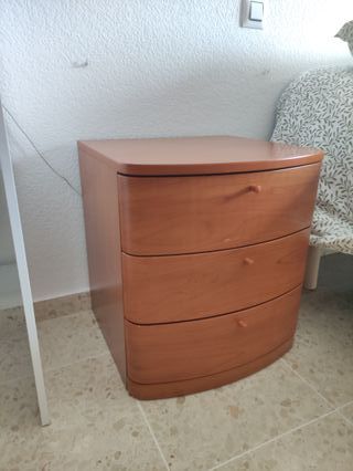 ¡Hola! Vendo este conjunto de dormitorio por cambio de decoración. Están en perfecto estado, muy cuidados y listos para darle una segunda vida a tu casa. Son muebles de buena calidad y con gran capacidad de almacenaje. ¿Qué incluye el pack? Cómoda: Con 4 cajones amplios que deslizan perfectamente. Ancho(1m) x Alto(0.7m) x Profundo(0.5m) 2 Mesillas de noche: A juego, con el tamaño perfecto para lámparas y libros. Tienen 3 cajones cada una. Ancho(0.5m) x Alto(0.55m) x Profundo(0.48m) - Diseño curvo y elegante. - Cabecero para cama de 135 a juego con el pack opcional. (Preguntar por el)
