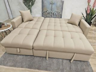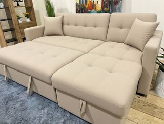 Sofá cama en color beige, con muy poco uso, prácticamente nuevo. - Tapicería de tela. - Diseño moderno y funcional.