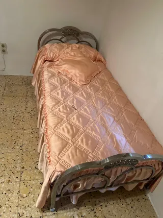 Estructura de cama con un diseño elegante y moderno. - Marco de metal resistente. - Incluye falda de cama. - Color plateado y blanco. - Teléfono de contacto 677425510