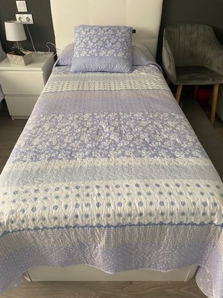 Se vende conjunto de cama individual ideal para habitaciones juveniles o de invitados. Se incluye todo lo necesario, cabecero, piecero, somier, colchón con 5 años y muy buen estado, protector de colchón lavable, colcha con diseño geométrico en tonos azul, naranja y amarillo y cojín decorativo a juego. Se encuentra desmontada para recoger por el comprador.
