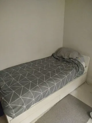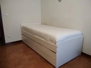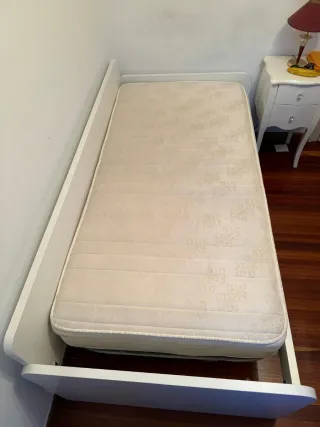 Se vende cama individual de 90cm con su colchón viscolastico. Es el modelo Släkt de Ikea.(En las fotos se ven las medidas) - Estructura de madera color blanco. -Colchón viscoelástico. *Recoger en Aperribai(Galdakao), no se envia*