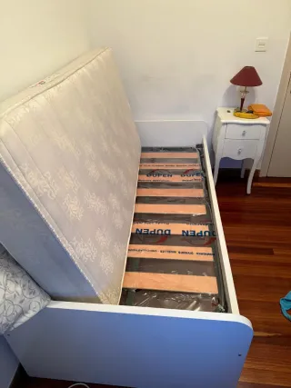 Base de cama articulada de la marca Flex. Se incluye colchón. La cama es de 90cm. El colchón es de 80cm, pero cumple su función. - Estructura de madera con láminas flexibles. - Mecanismo de elevación para ajustar la posición. - Soportes de plástico para las láminas. - Estructura robusta y resistente - Diseño elegante y discreto. La cama se encuentra en Sarriko, y habría que venir a recogerla. No sé realizan envíos. Urge la venta por reforma de la habitación. No tengo intención de tirar el precio. Si no se vende me desharé de ella.