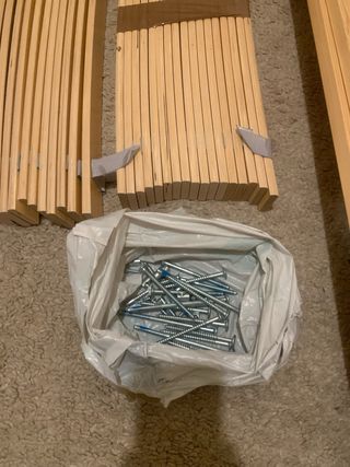 Base de cama de pino, lista para montar. Incluye todas las piezas necesarias para su ensamblaje. - Listones de madera de pino. - Estructura de cama. - Tornillería para montaje. En buen estado. Se vende por mudanza.