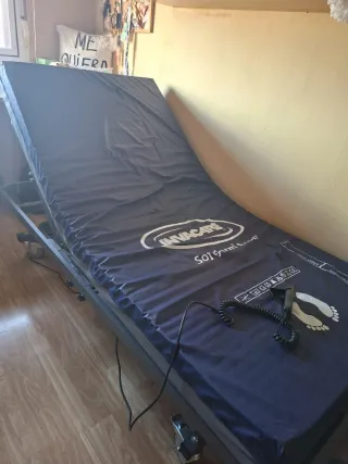 Cama articulada eléctrica con colchón antiescaras viscoelástico 105 cm x 190 cm y mando. - Solo un mes de uso - Precio original 1200€ - Estructura de acero recubierta con epoxy de alta resistencia - Bajada de emergencia en caso de falta de corriente - Colchón de Antiescaras Viscolastico, autoextinguible, parte superior ignifugo con forro impermeable - Elevación independiente o simultánea de cabeza y pies - Barandillas de seguridad abatibles. - Cabecero - Piecero Incluye: Colchón antiescaras de aire MOBI 1 (Mobiclinic) con celdas de burbuja en PVC. Ayuda a prevenir úlceras por presión, incluye bomba silenciosa regulable.