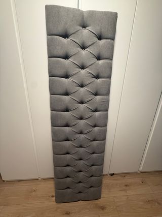 Cabecero de cama tapizado con un diseño capitoné. - Medidas: 190 cm de alto x 56 cm de ancho. - Acabado en tela gris. - Diseño capitoné con botones.