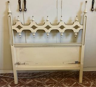 Cabecero de madera tallado. Tono crema y detalles en dorado. Parte superior en perfecto estado. Rotura de madera en parte inferior. Medidas: alto 112cm, ancho 97cm, fondo 4 cm. 🫱🏼 🫱🏼 Se entrega en mano y recoge en domicilio situado en Castelló de La Plana. 305