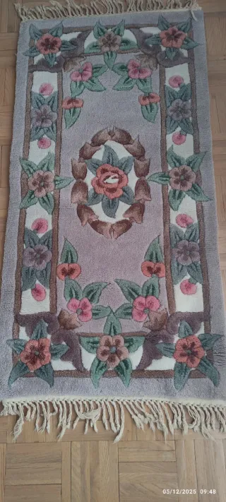 Alfombra de lana con un bonito diseño floral. - Ideal para colocar a los pies de la cama. - Colores principales: verde y rosa. - Material: lana.