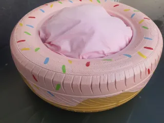Original cama para mascotas con forma de donut, elaborada a partir de una rueda reciclada. Un accesorio único y sostenible para tu compañero peludo. - Diseño llamativo con detalles de sprinkles de colores. - Base con acabado imitando madera.