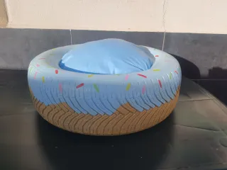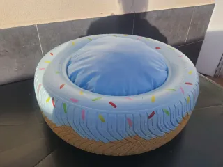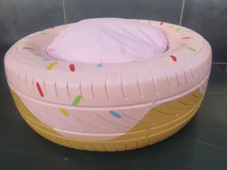 Original cama para mascotas con forma de donut, creada a partir de una rueda reciclada. Un toque divertido y sostenible para tu hogar. - Diseño inspirado en un donut. - Base acolchada para mayor comodidad.