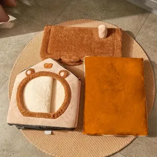 Acogedora cama tipo casa para mascotas, con un diseño adorable. - Material suave y confortable. - Forma de casita con entrada circular. - Detalles de osito en la parte superior.