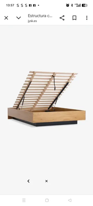Estructura de cama con un diseño moderno y funcional, en un acabado de roble cálido. Perfecta para un colchón de 150x190 cm. - Base de listones de madera. - Sistema de elevación hidráulico para almacenamiento.
