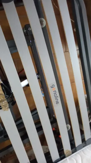 Cama hospitalaria de la marca Gerialine. Estructura robusta y diseño funcional. - Base de láminas de madera. - Marco de metal resistente. - Soportes de plástico para las láminas.