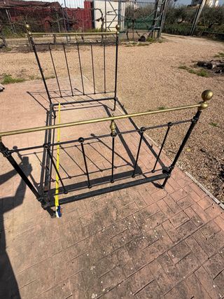 Preciosa cabecera y piecero de cama antiguos de forja. Ideales para darle un toque vintage a tu dormitorio. - Ideal para quien se le de bien y la quiera restaurar. - Piezas de forja con un diseño clásico. - Presenta un bonito color marrón oscuro con detalles en negro. - Se aprecian signos de antigüedad y uso, lo que le da un encanto especial.