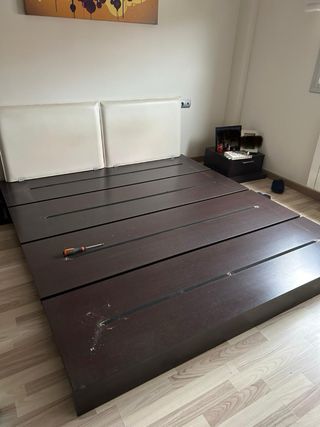 Estructura de cama con somier. - Materiales: plástico y madera. No incluye colchón,estructura y somier de madera buen estado desmontaje a cargo del comprador ,ascensor y posibilidad de parar en la puerta fácil acceso de recogida . Recogida en CALAFELL por eso el precio económico